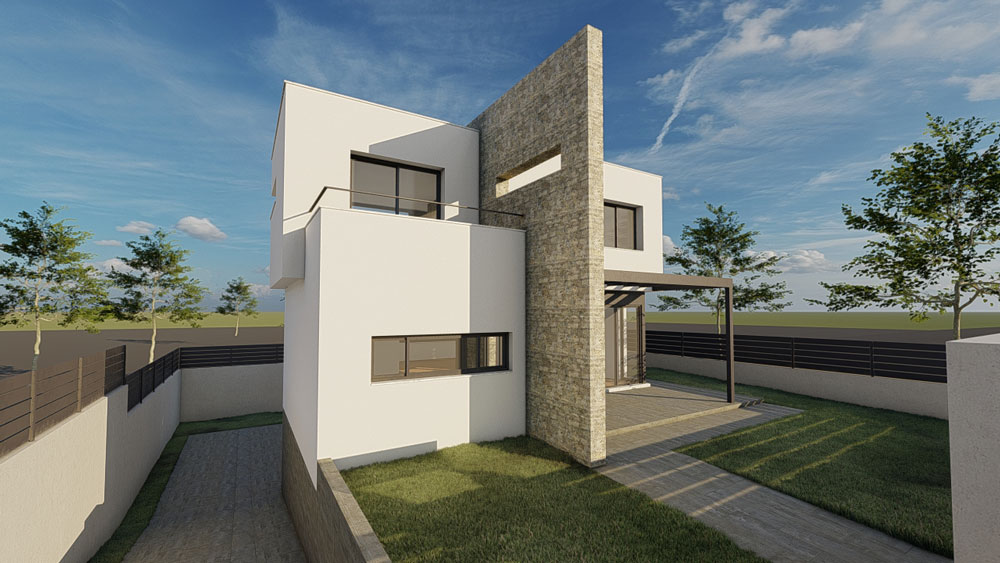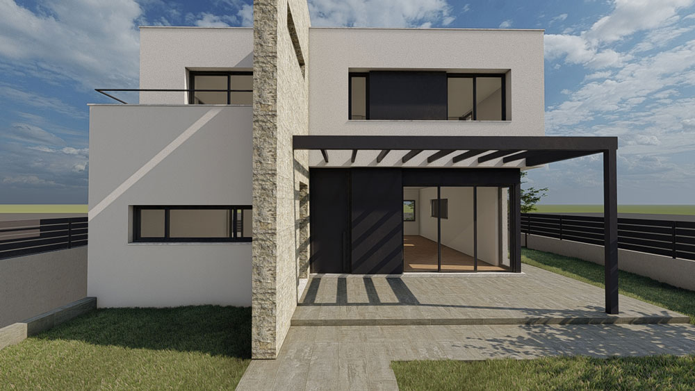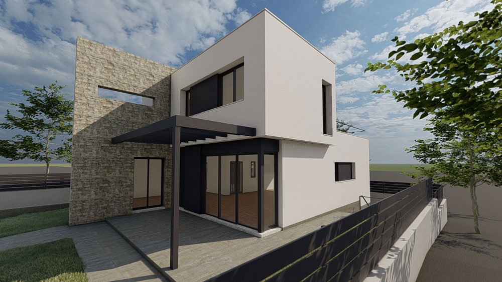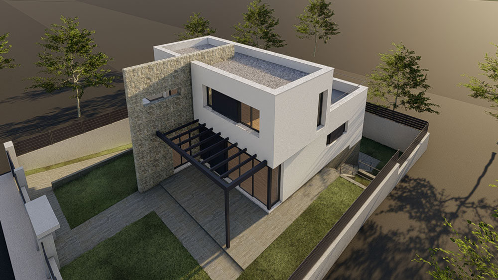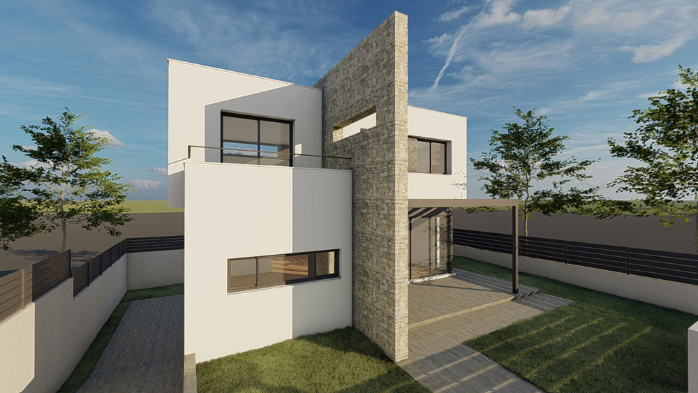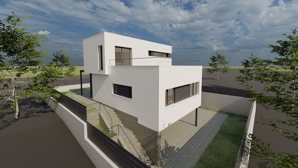 Vivienda Unifamiliar con terraza, muro de piedra y jardín. La vivienda se desarrolla a partir de un muro central de piedra vista y de la terraza frontal. Consta de planta baja dividida en zona de día y noche con 2 habitaciones y de planta primera con la habitación principal y un espacio multiusos. Se han habilitado 2 terrazas, vinculadas cada una a un espacio distinto.