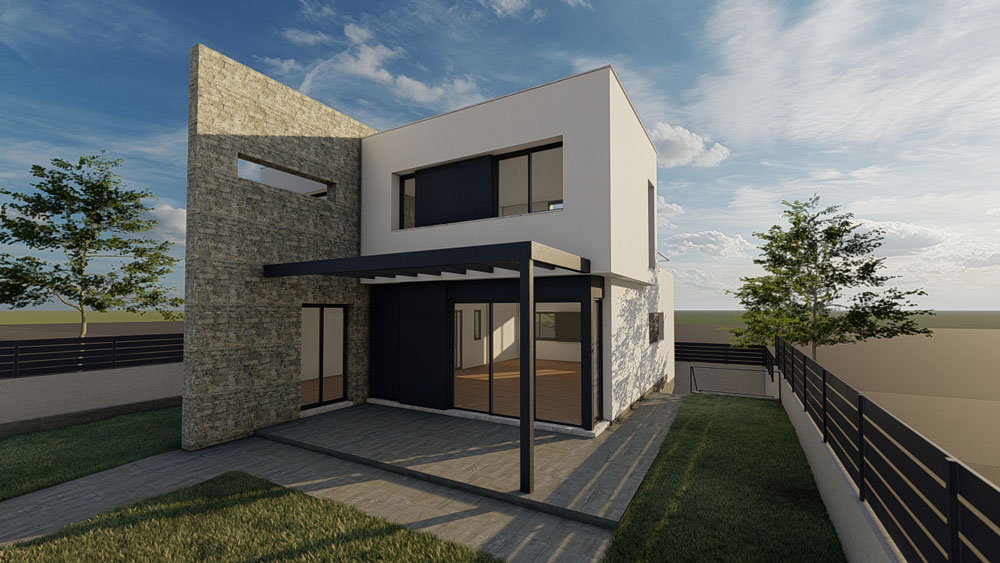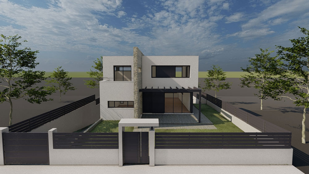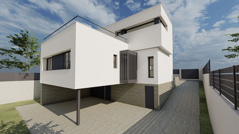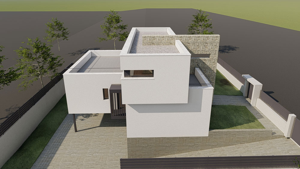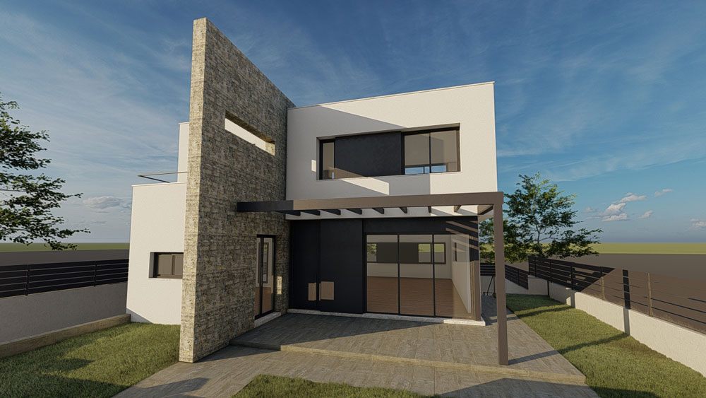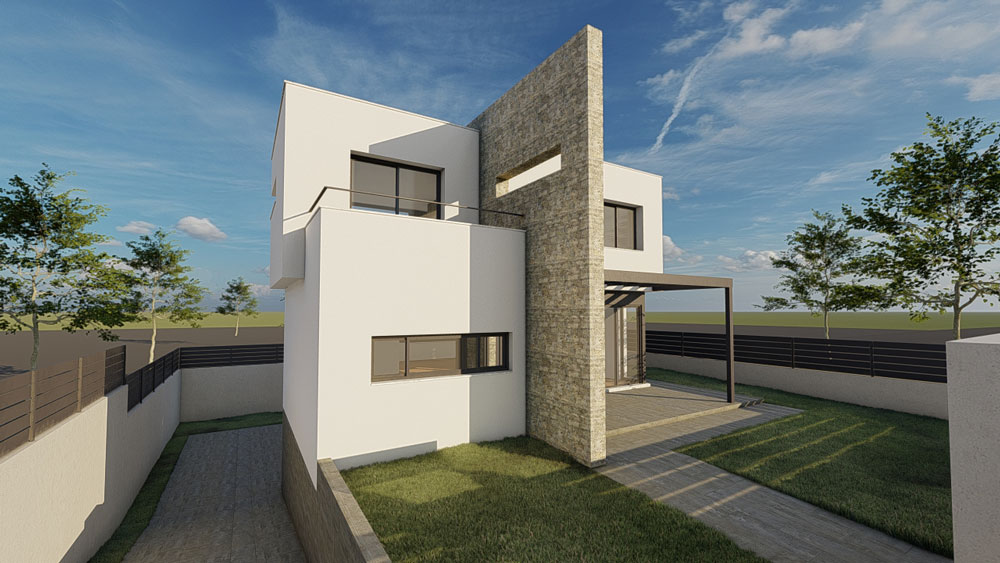 Vivienda Unifamiliar con terraza, muro de piedra y jardín. La vivienda se desarrolla a partir de un muro central de piedra vista y de la terraza frontal. Consta de planta baja dividida en zona de día y noche con 2 habitaciones y de planta primera con la habitación principal y un espacio multiusos. Se han habilitado 2 terrazas, vinculadas cada una a un espacio distinto.